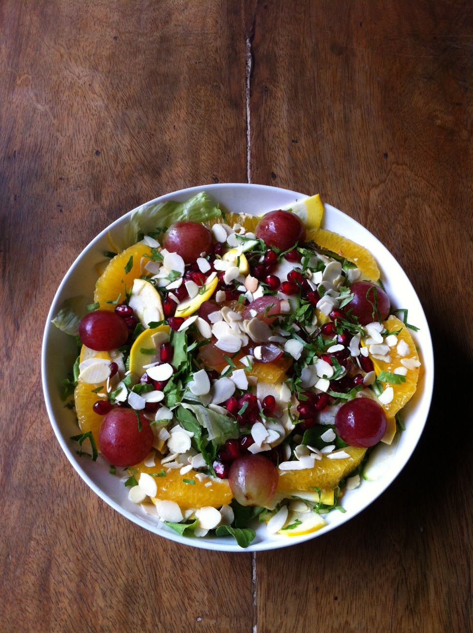 roquette, oranges, pomegranate, zucchini, seasonal fruits, toasted almonds,