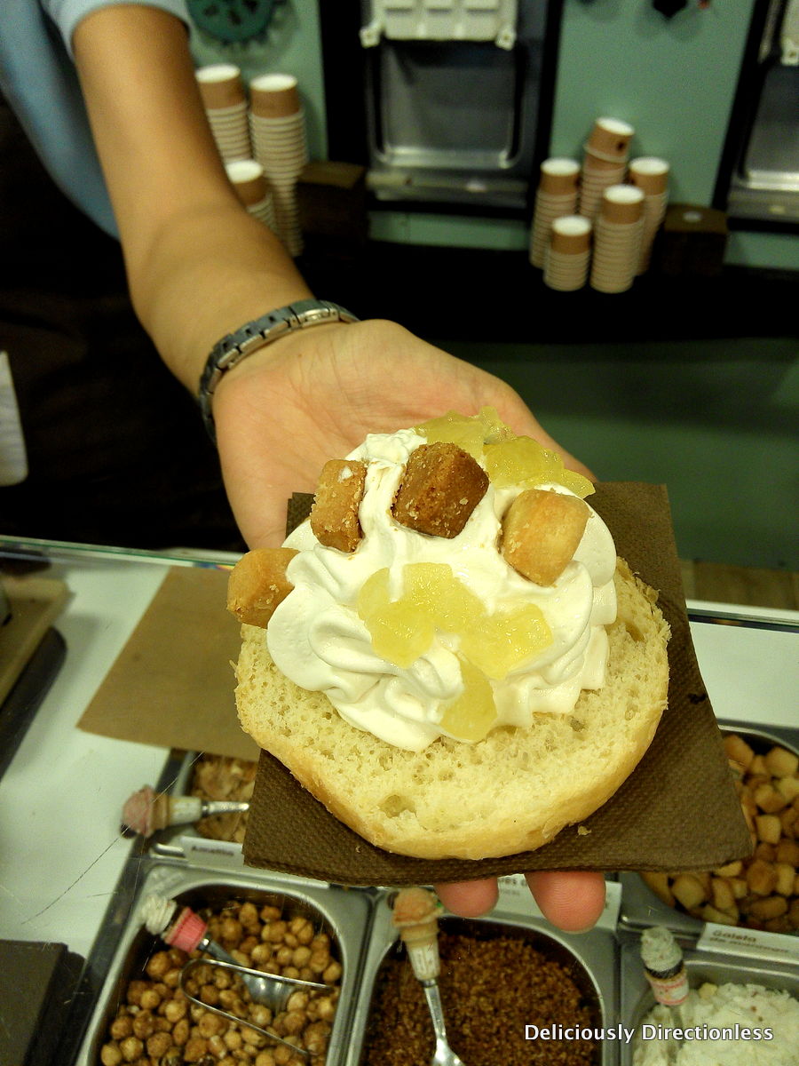 At the gelateria, I tried their famous panet, a take on the gelato in brioche popular in Sicily, Italy (see this photo-essay on Palermo). They cut a brioche in half (horizontally), scoop some ice cream on the bottom half, top with nuts, chocolate and suchlike, cover it with the brioche ‘lid’ and place it in a sort of grill sandwich maker. I had my panet stuffed with baked apple ice cream (vanilla with baked apple, caramelised apple & shortbread) and it was all kinds of delicious – hot on the outside, cold on the inside, and utterly delish! What a great way to end a lovely day trip 🙂