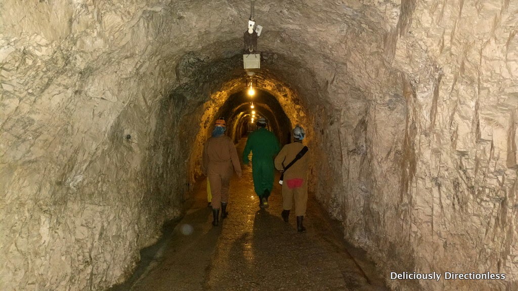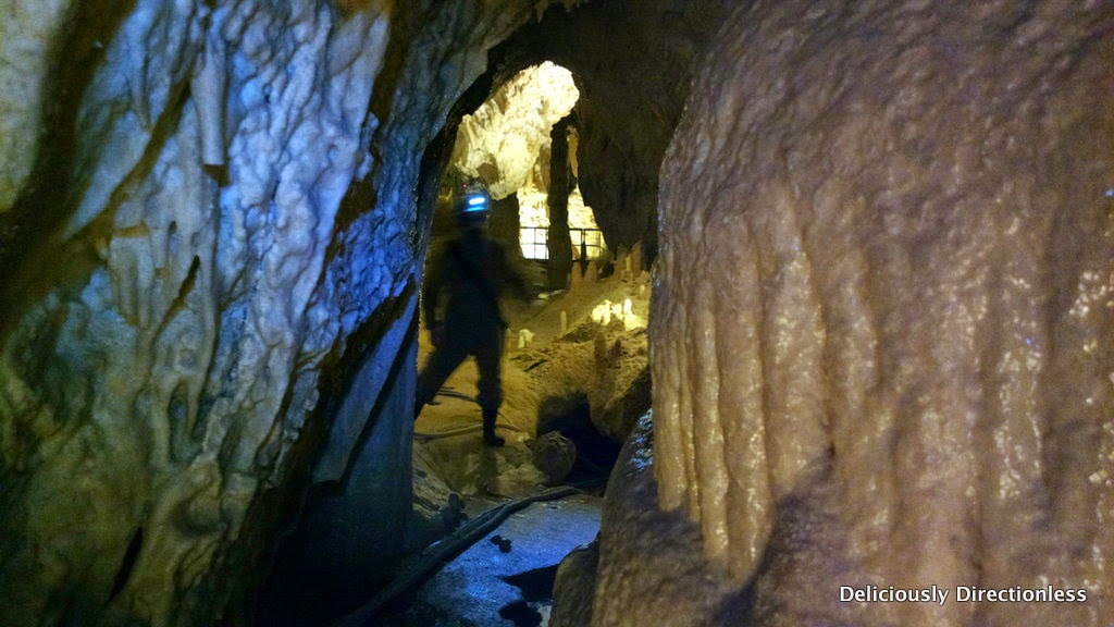 At the visitors’ centre we met our guide Graziano who helped us get kitted out for our underground adventure. The main tourist route is an easy walk, with lots of stairs and ramps built on a path that cuts through the cave. But we were signed up for a speleological expedition, which would go beyond the tourist route and really explore the cave system. So we had to don protective clothing, rubber boots and hard miners’ hats, complete with a headlamp – it was all terribly exciting!