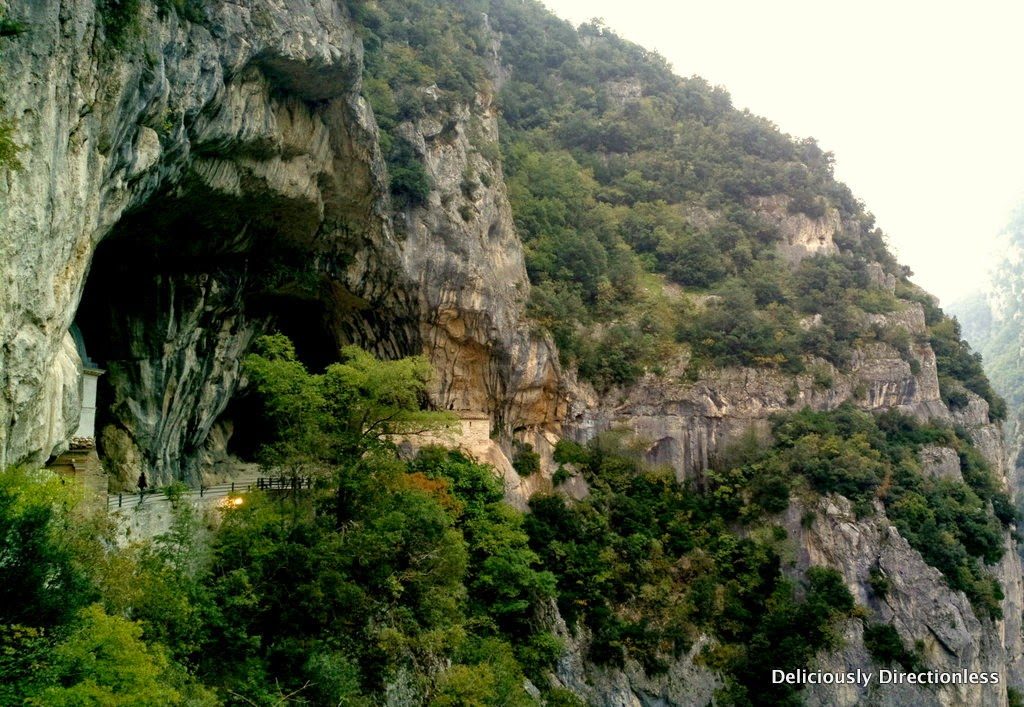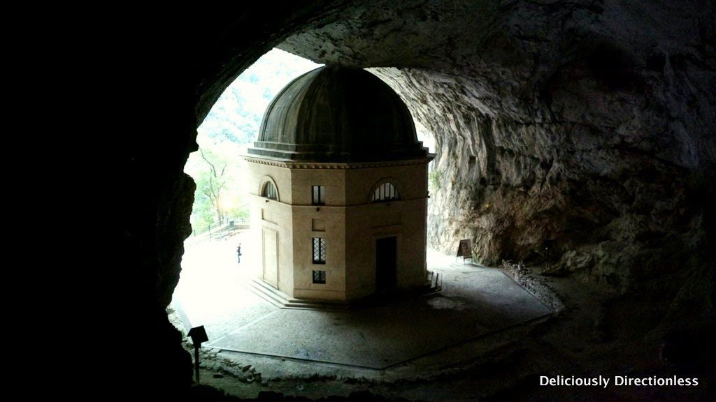 PinQuite unlike most churches, this ‘temple’ is topped with a dome. The church’s interior is plain, in stark contrast to the opulently decorated and frescoed Italian churches. But then this place is a “refuge of sinners”. In the 10th century, this cave (and many others in the nearby hills of Genga) was a place where locals sought refuge from the marauding Hungarian tribes. When construction of the church began, human bones, artefacts and coins dating to the Bronze Age were discovered in the cave. Today the Temple of Valadier is a pilgrimage site for believers seeking forgiveness for their sins. There’s a small shrine at one end of the cave, with an altar where people have left behind offerings and messages of repentance.