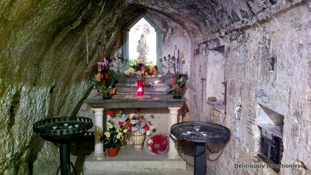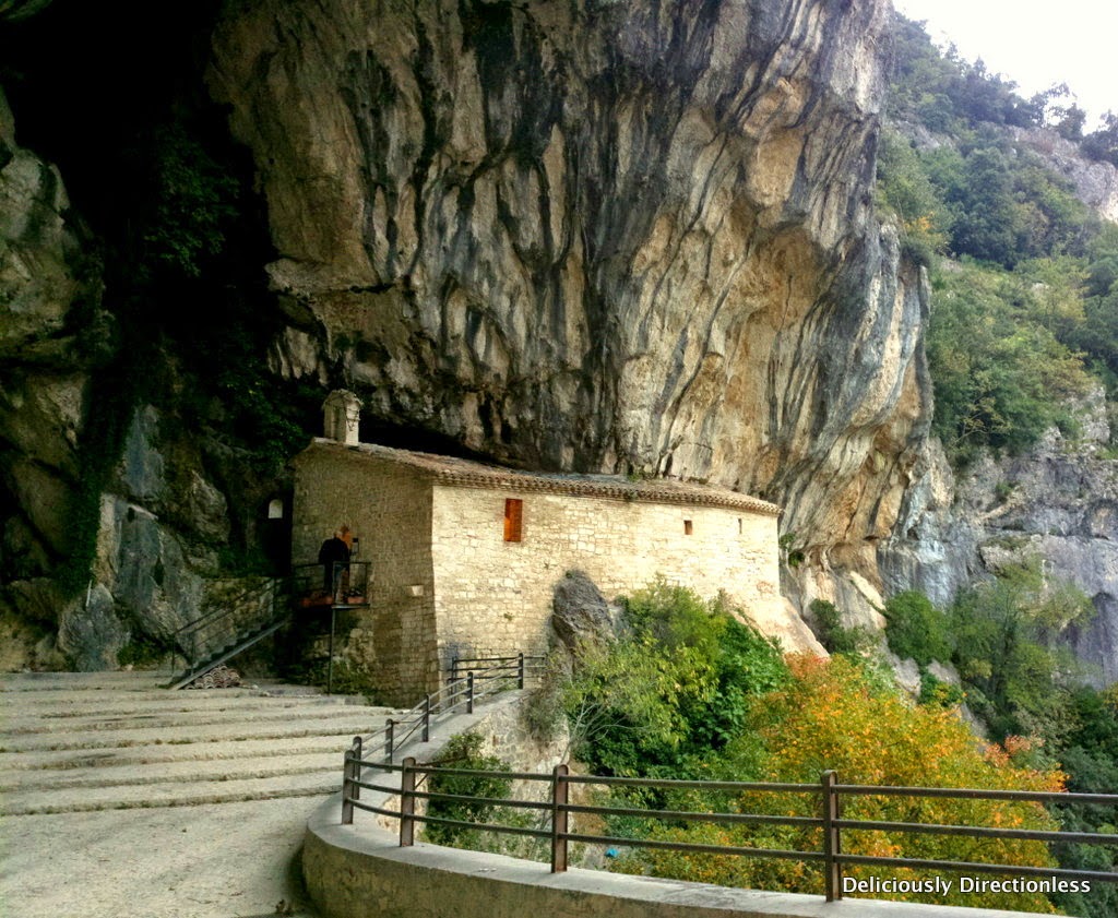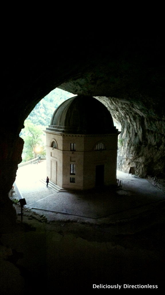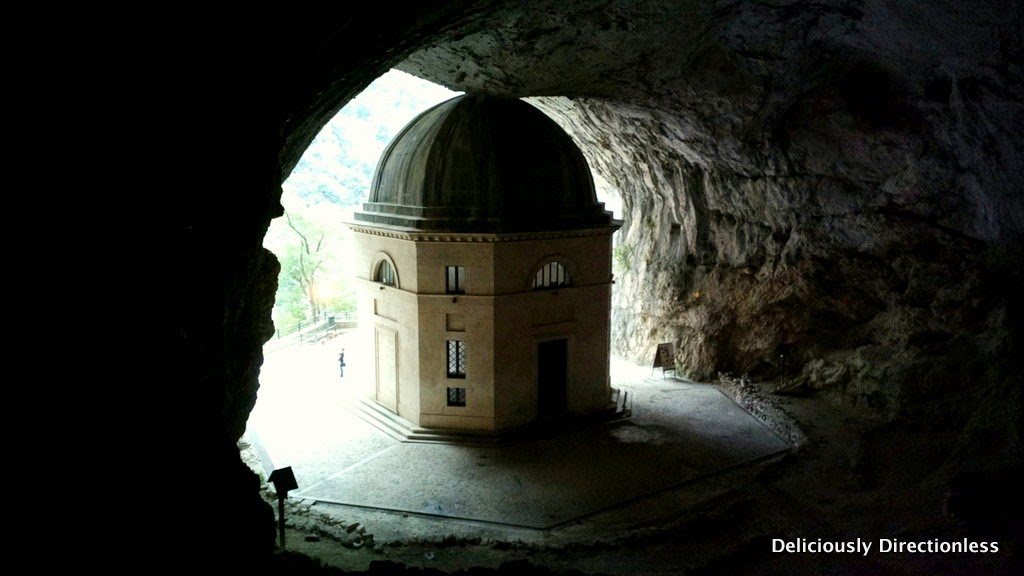 The striking church, built in 1828, stands just inside the mouth of a natural cave. The octagonal church was designed by the Italian architect Giuseppe Valadier in his characteristic neo-classical style, and was built with white travertine blocks extracted from the stone quarry above the cave. The perfect symmetry of the church, built by Man, stands against the rough walls of the cave, hewn by Nature – it’s quite a sight to behold, and well worth the effort of the steep climb!