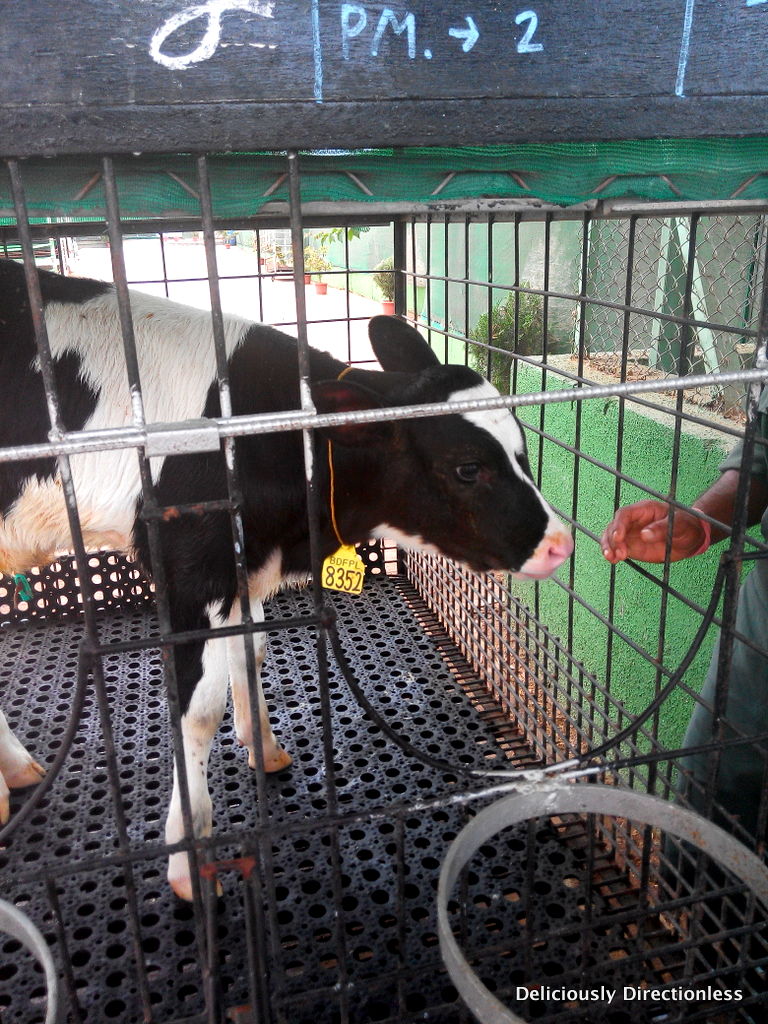 On day one I headed to Manchar (37 kms away) to visit the cheese factory of Gowardhan Group, one of the biggest dairy farms in western India. I met Madhuri Somavanshi, the Marketing executive at the factory, who gave me a guided tour around the factory. It was fascinating to watch these massive machines churn out kilos of cheese! Go Cheese makes several varieties, including cheddar, gouda, paneer and even mozzarella (for which the machinery has been imported from Italy). All cheese is made using microbial rennet, so it’s 100% vegetarian. After the factory, we drove to their dairy farm, where I met this 3-day old munchkin 🙂