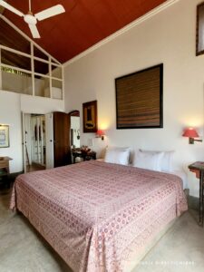 Walking into Ahilya by the Sea is like entering the elegant home of a favourite aunt with impeccable taste. Eight rooms are spread over the three villas, all with spectacular sea views. The partial sea-view Music Room and a charming treehouse called Arjun’s Tower complete the offering. Every villa has common living rooms, private sit-outs, and shaded verandahs — frankly, it’s hard to decide where to lounge. Our room Barcos is on the upper level of the Sunrise Villa. It’s a beautifully appointed, light-filled space with white-washed walls and an eclectic collection of wall art and artefacts. In fact, the entire property is filled with an incredible assortment of art and antiquities from the owners’ personal collections. Plus there are books on a wide range of subjects. I pick up “Matisse in Morocco” for some light bedtime reading while my husband kicks back with “How Music Works”.