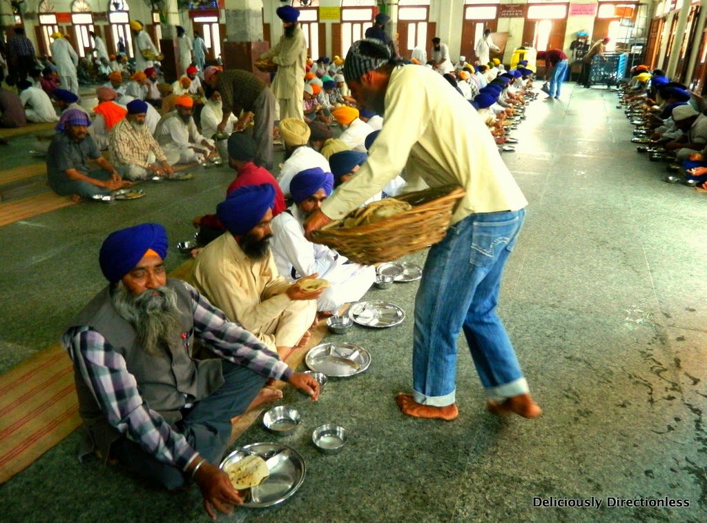 Back in the langar hall, I sit to eat with strangers. In keeping with the tenets of Sikhism, all barriers of religion, caste, and social status are obliterated as diners share a meal as equals, sitting on the floor in a line (pangat). With a call of “Jo bole so nihal… sat sri akal”, we begin eating.
