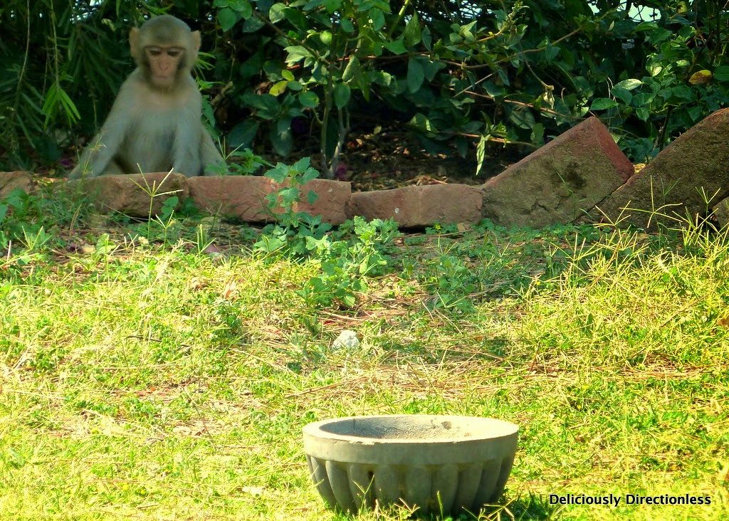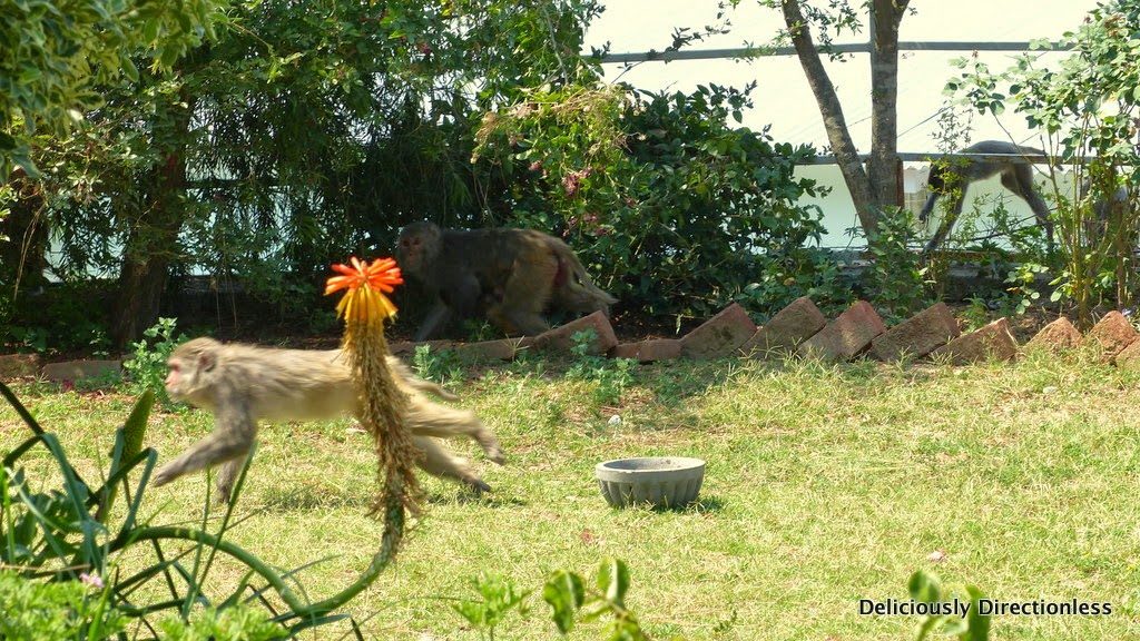 … and monkeys dropping by to invade the fruit trees and to take a sip from the water bowl!