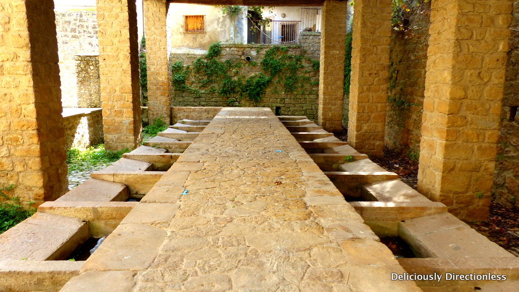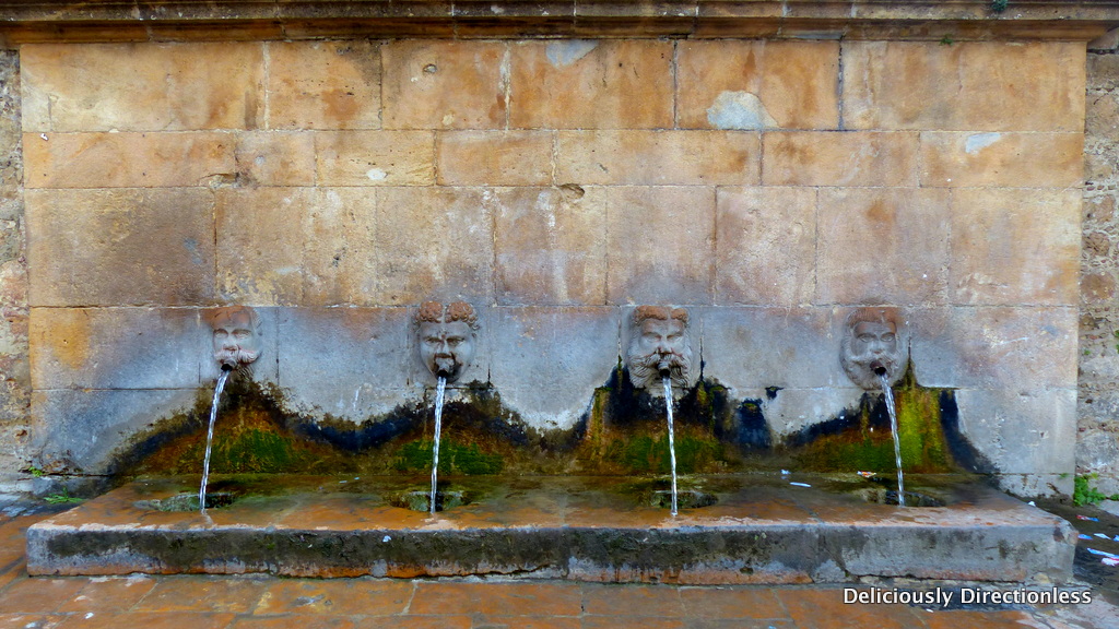 Next to the laundry is the public water fountain, still gushing out potable water from the river Gela. The spouts arise from the mouths of four fierce-looking sandstone masks, which are said to be the likenesses of Bourbon kings.