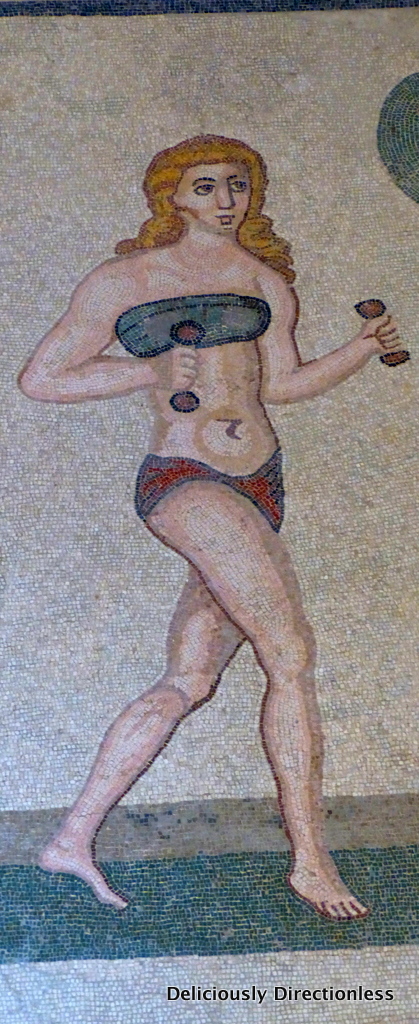 My favourite mosaic was ‘the bikini girls’, which depicts sporty young women lifting weights, throwing the discus, running etc. Feminism was alive & well back then, it seems!