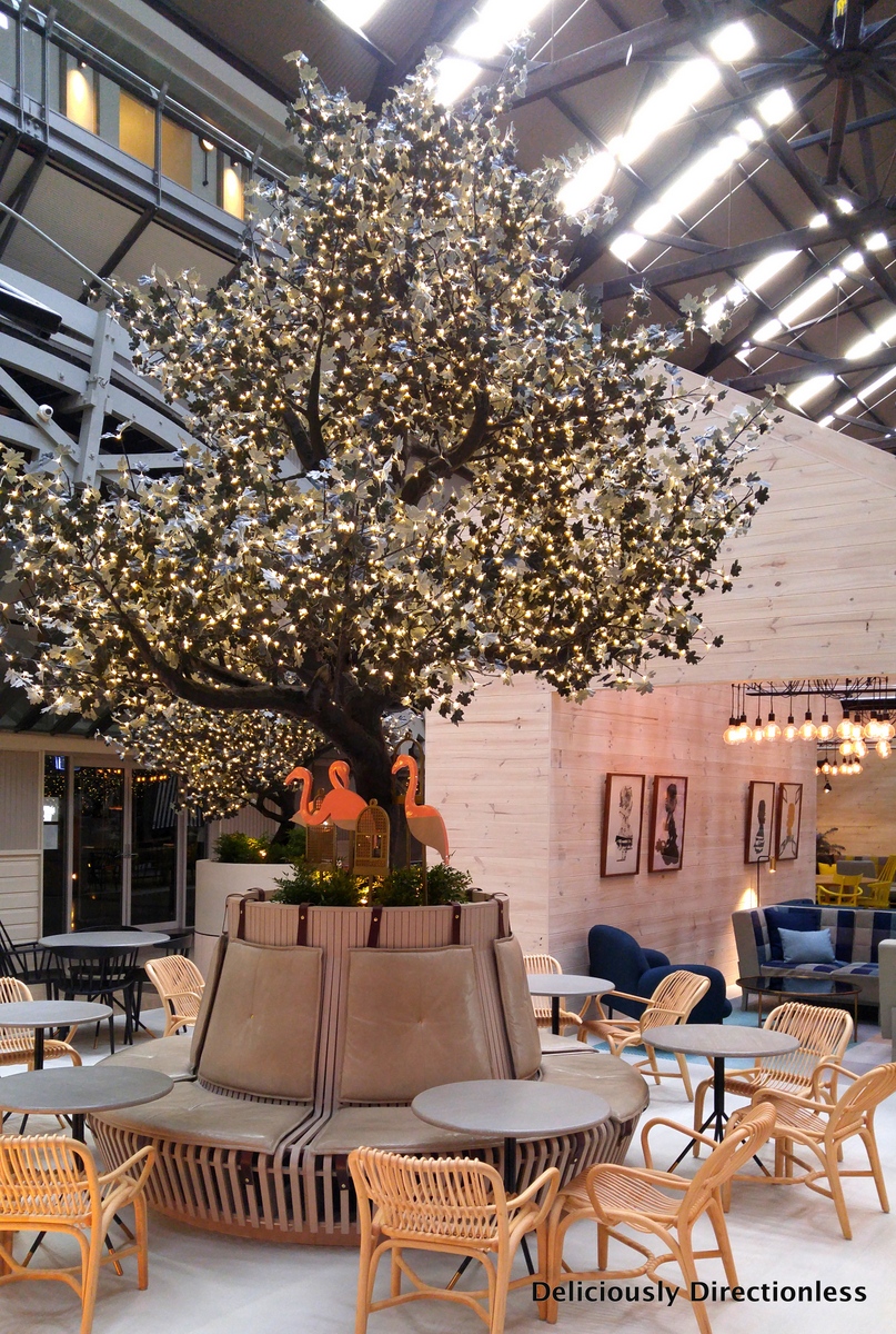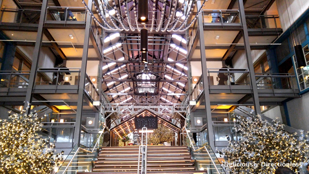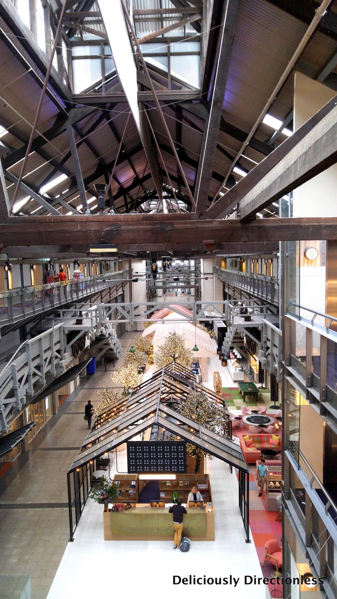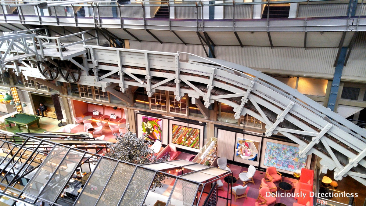 For instance, the pulley and ramp mechanism used to move goods still stands on either side of the long lobby, artfully incorporated into the decor.