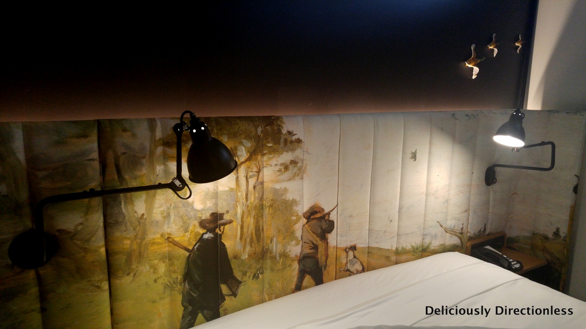 The quirky and colourful decor continues to the rooms as well. I had a spacious room with a huge bath and shower. All the bed headboards are pretty cool – mine had a reproduction of a painting of two hunters shooting at a strategically placed group of three ceramic flying ducks installed on the wall above the bed. Such a fantastic way of integrating art and design!