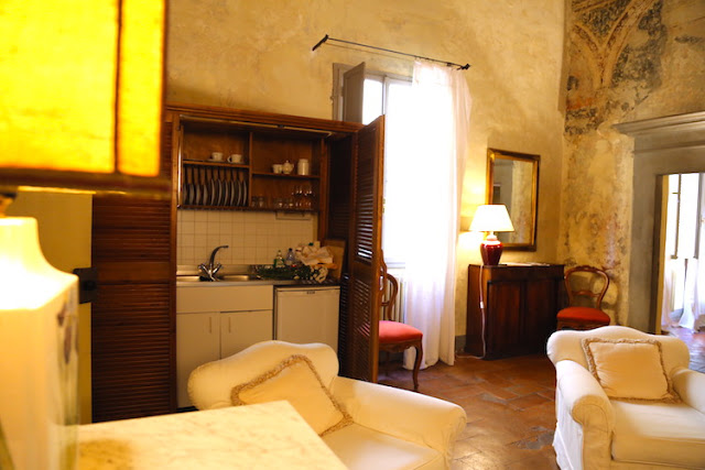 The 14th-century building is completely renovated and refurbished, with seven apartments available for short & long stays. All apartments are named after prominent Italian noble men and women, and are tastefully furnished. My favourite was the Clarice apartment, which used to be the main living area of the palazzo and was decorated with beautiful frescoes; parts of these frescoes are still visible today (pictured below).