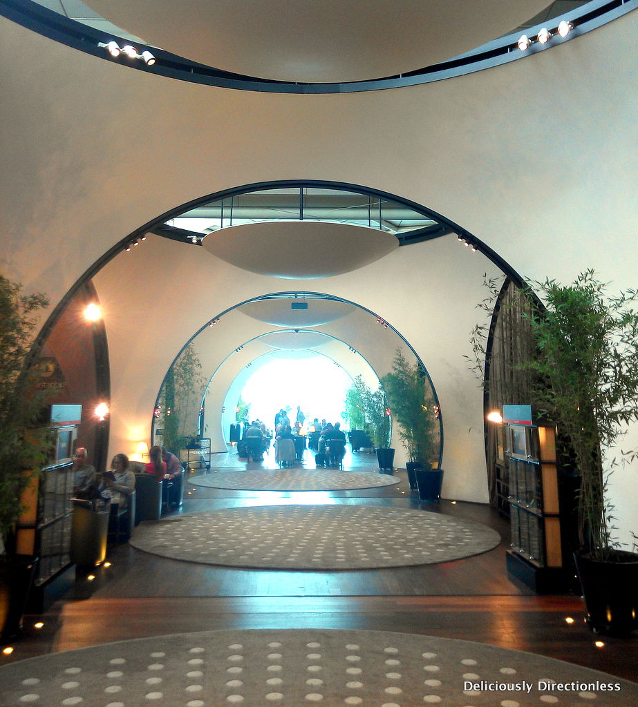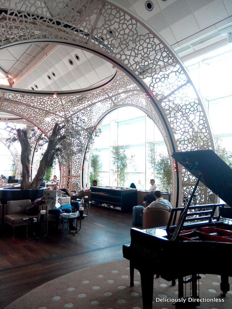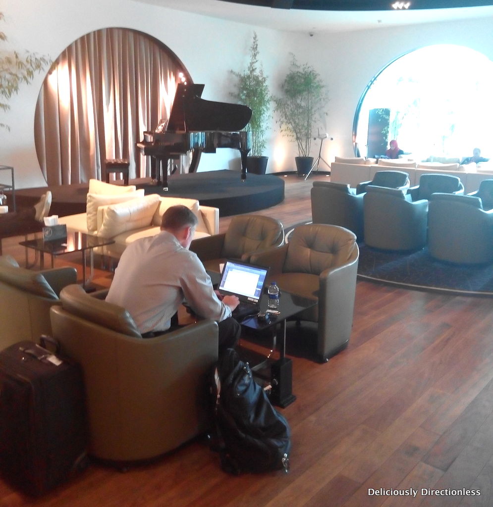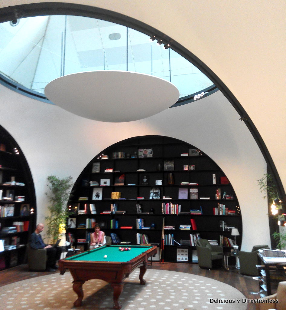 PinThere are private relaxation lounges, showers (the bathrooms have some fancy toiletries), play area for kids, a billiards table, a simulated golf course, and my favourite of all, a library.