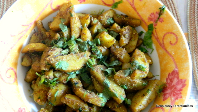 potato wedges, turmeric, coriander powder and grated ginger. Cover and cook