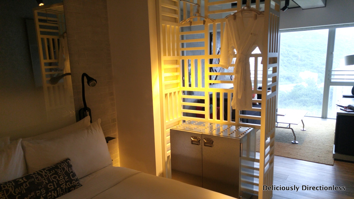The room is large for HK standards – a nice seating area with a couch, centre table and an Apple TV. In keeping with the industrial chic feel of the place, there are exposed pipes overhead. Pin