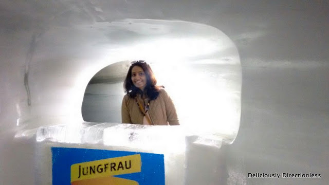 The last leg of the journey was partly underground, through a tunnel that bores through Eiger and Mönch. There were stops on the way and I could see Jungfrau looming closer, and wide expanse of snowy plains all around. It was biting cold in the tunnel and I was glad to step out in the relatively warmer assembly point at the station. From there we were taken for a walk through an icy tunnel, lined with some ice sculptures.
