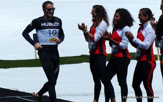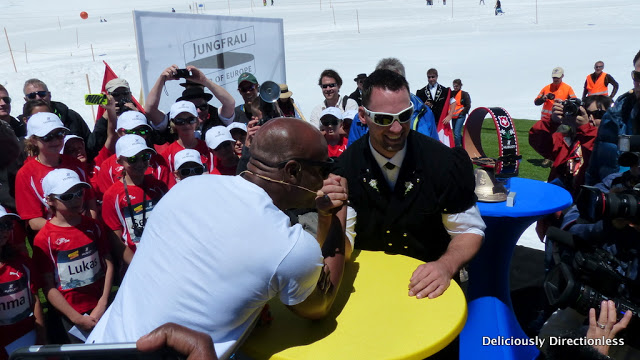 It was almost time for the main event to begin (and the Swiss are sticklers for time!), so Powell did a few practice runs and Cologna tested out the ski terrain. The Swiss wrestler Kilian Wenger fired the start pistol and the two men were off! Powell zipped by like a bullet, but Cologna rapidly caught up with him and it was a photo-finish at the end.