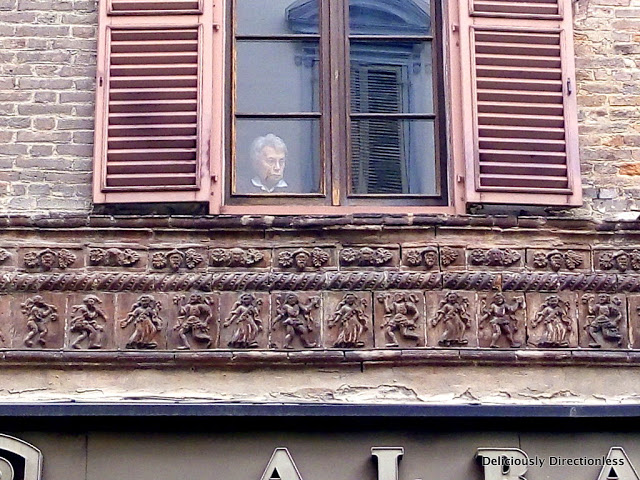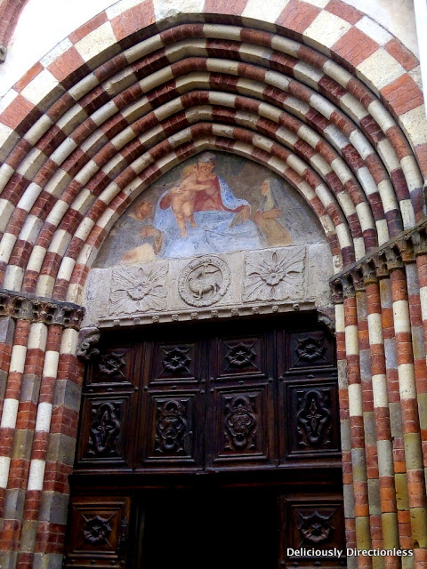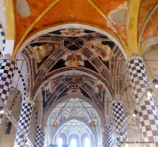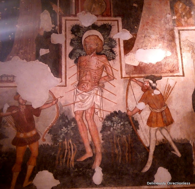 But the church I would recommend most is the Gothic church of San Domenico (pictured above). Inside the 13th-century church there are several stunning frescoes on the walls and ceiling, which have recently come to light and are being restored. The frescoes were covered with seven layers of paint, having been repainted over the years. There are Nativity scenes of course, and one striking fresco of the martyrdom of San Sebastian. The church is not used for religious services anymore; instead it’s a venue for exhibits and concerts. There was a photography exhibition on when I visited.