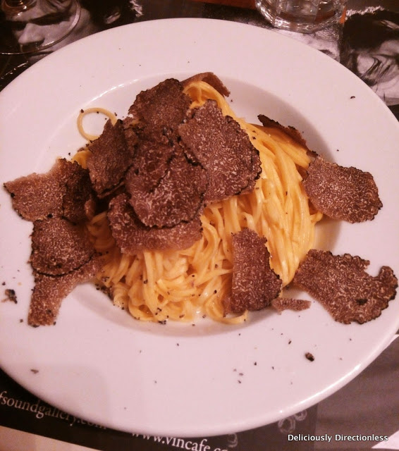 I had a plateful of tajarin pasta – a Piedmont specialty pasta, very thin and rich with lots of egg yolks in the dough. The pasta was tossed lightly in butter and generously topped with fresh, shaved black truffle – heaven on a plate! I paired the pasta with a crisp glass of Arneis, a white wine from the Roero hills of Piedmont.