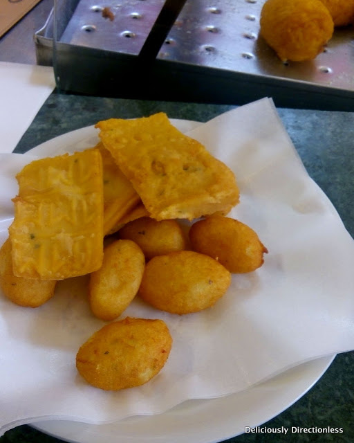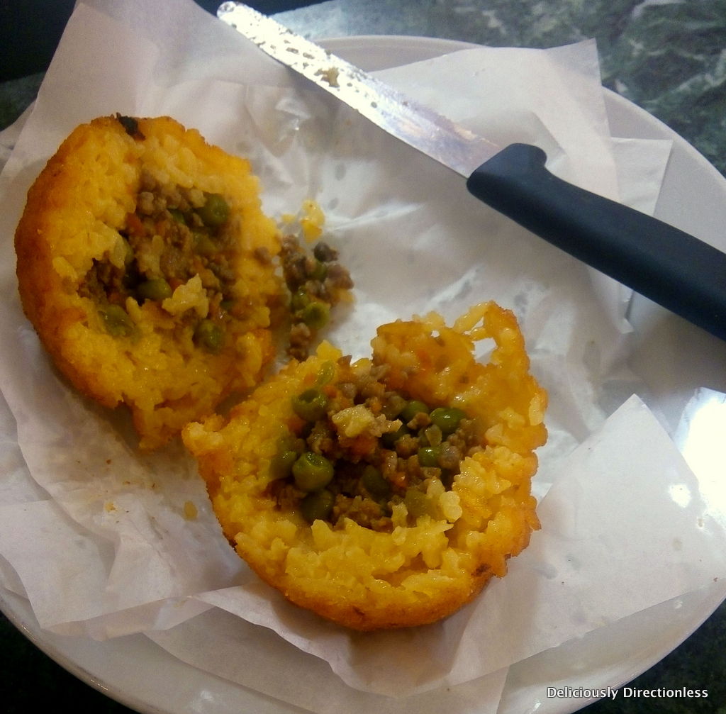 We have the panelle stuffed in a bread roll along with cazzilli – small potato and cheese croquettes shaped like small sausages, hence the name cazzilli or ‘little pricks’.