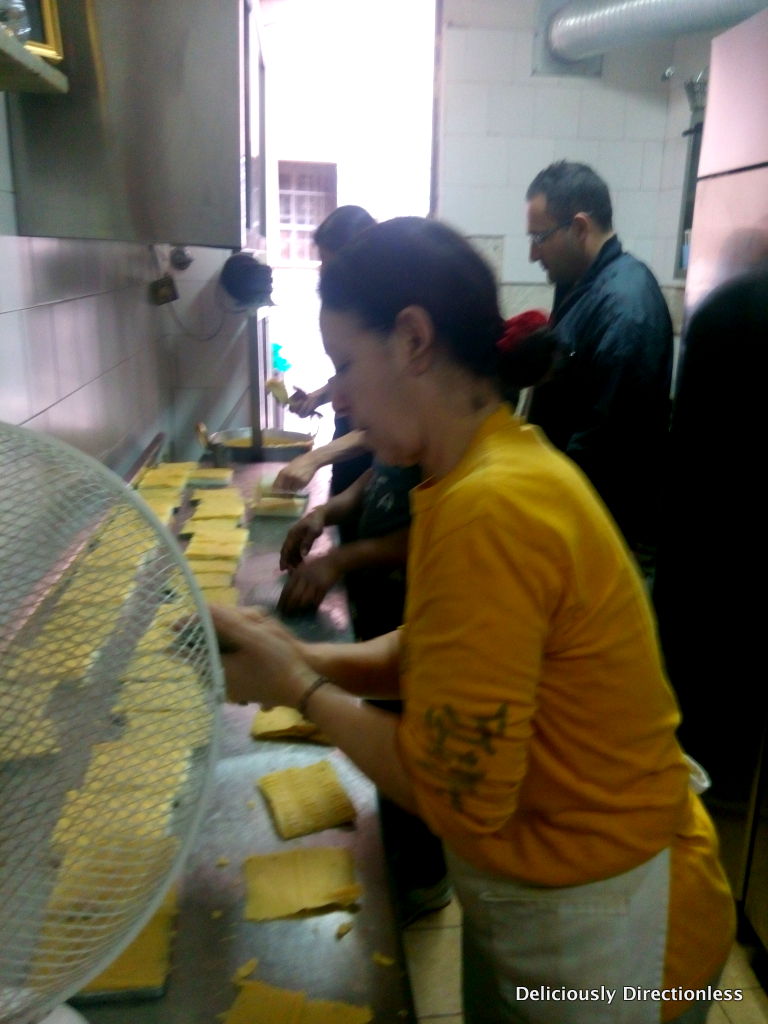 The arancina shop (Dainotti) also serves up more deep-fried goodies, including another Arab origin snack called panella (plural panelle). Chickpea flour is cooked in salted water with parsley and the thick mixture is spread on a metal surface. Once cooled, a heavy tile (with an embossed design) is used to cut fritters, which are then deep-fried. In the olden days the panelle were cut in the shape of a fish and flavoured with vinegar, to give the city’s poor a cheaper substitute to the fish they couldn’t afford.