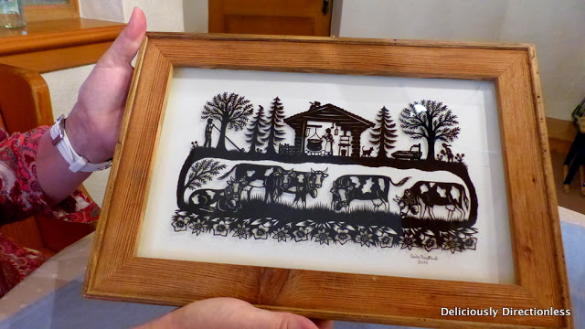 “There is no school teaching this art in Switzerland. I started making these artworks when I was a teenager and I am self-taught”, says Raaflaub. She shows me some of her works – intricate designs in black (on a white background), of cows grazing, goats and goatherds, prancing horses, chalets, even a farmhouse where a village belle is making cheese. My confidence is already taking a beating, as she whips out the piece that she is currently working on – a large doily the size of a dinner plate, on which she is cutting out an idyllic, Swiss village scene.