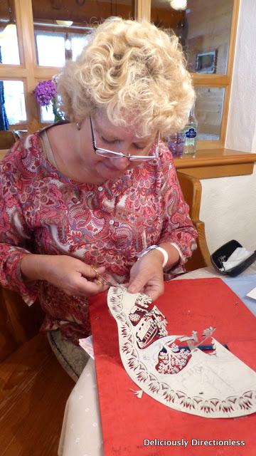 In Lauenen I am about to get a crash course in the art of scherenschnitte. Having managed just about average grades in craft all throughout school, I’m a bit hesitant to try what looks like an incredibly complicated and delicate job. I meet Anita Raaflaub, one of the well-known artisans from Lauenen, at a café on the outskirts of the village.