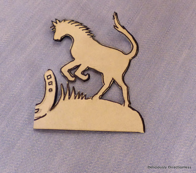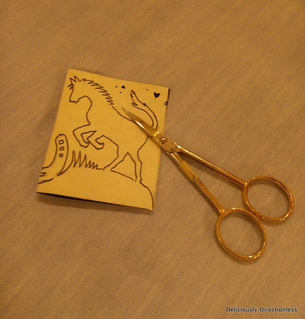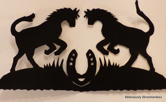 I gently open the folded paper and my scherenschnitte artwork is ready – 2 horses, rearing on their hind legs, with their forelegs up in the air, ready to gallop off, tails swinging and manes aflutter. The curved stump in the middle has opened up to form a horseshoe in between the horses.