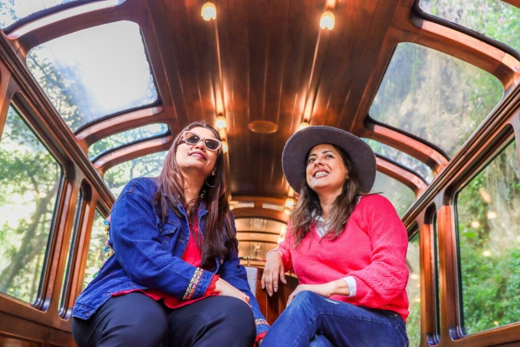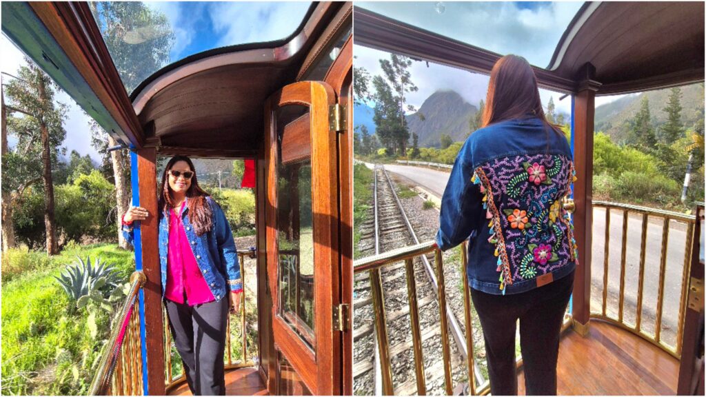 I checked out early from Tambo del Inka, a gorgeous Luxury Collection property by Marriott. The Ollantaytambo train station was about 20km (30 mins) from the hotel and I made it in time for my 7.45 am departure. The indigo-blue train was just chugging into the station as I arrived, so I promptly boarded. My travel companions were Veronica Smulders (the owner of Peru Travel ME), our fab guide Juan, and Marco Guzmán, a pro photographer who shot many of the lovely photos in this post! By the way, the gorgeous jacket I’m wearing is made by a Peruvian brand, Cora (gifted to me by Veronica who is pictured below). Our outfit twinning is completely by chance!