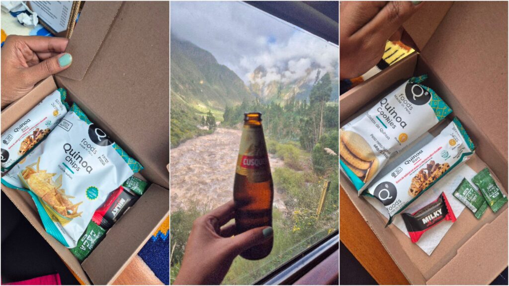 We got a snack box (included in the ticket) with chips, an energy bar, and some sweets plus tea or coffee. However, I was more interested in sampling the famous Cusqueña beer that was available at the bar!