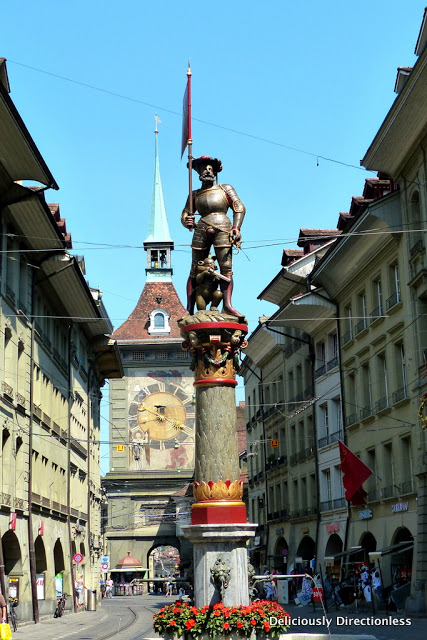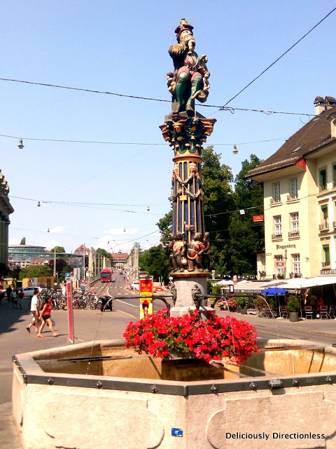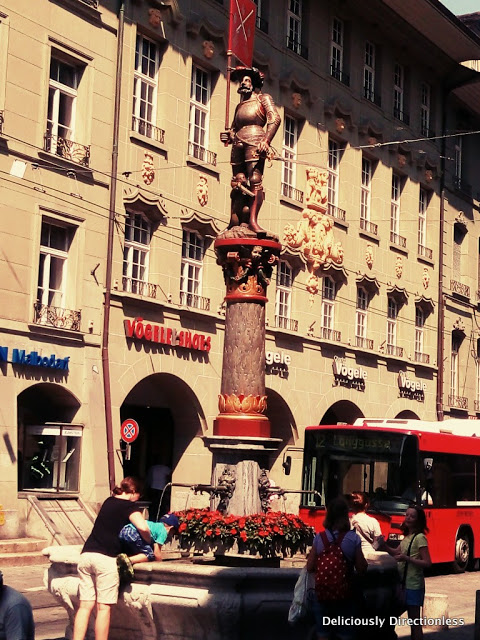 Every few minutes, fire-engine-red trams run along the street and we have to be careful crossing over to the middle to admire one of many fountains in Bern. The ‘City of Fountains’ is home to more than 100 public water fountains, which were added in the 16th century to show off the power and wealth of the city, and of course to provide fresh drinking water to the citizens. The fountains still perform the latter function and we had been partaking of them all throughout the tour, to keep hydrated and to try and beat the relentless heat.